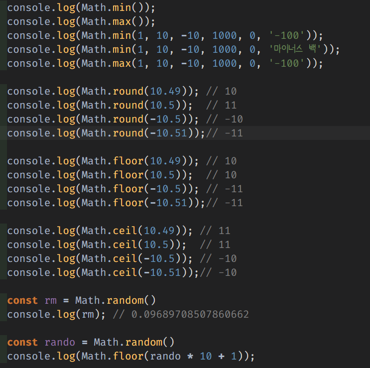 - 수학에서 자주 사용하는 상수와 함수들을 미리 구현한 자바스크립트 표준 내장객체